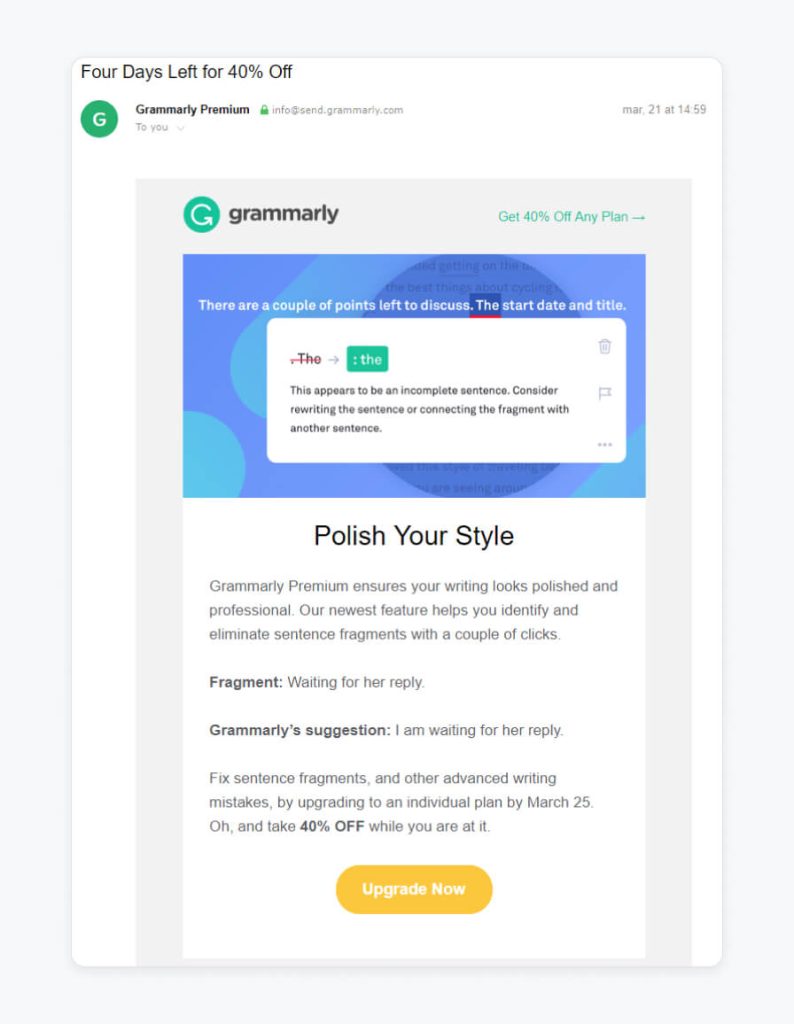SaaS brands send this kind of follow-up to encourage the purchase and re-engage the recipient by indicating the benefits of a platform like Grammarly Premium, highlighting its value for the users in this example.