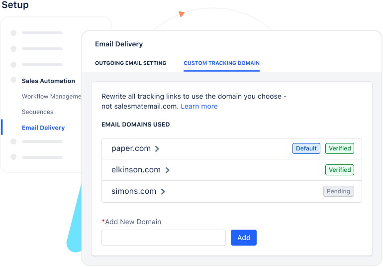 By using a custom domain, the servers recognize your company domain, and the email stands out among others. You can easily set up your custom domain and use email tracking features such as “email opens,” and “email clicks” to build credibility or plan your follow-ups among your prospects.