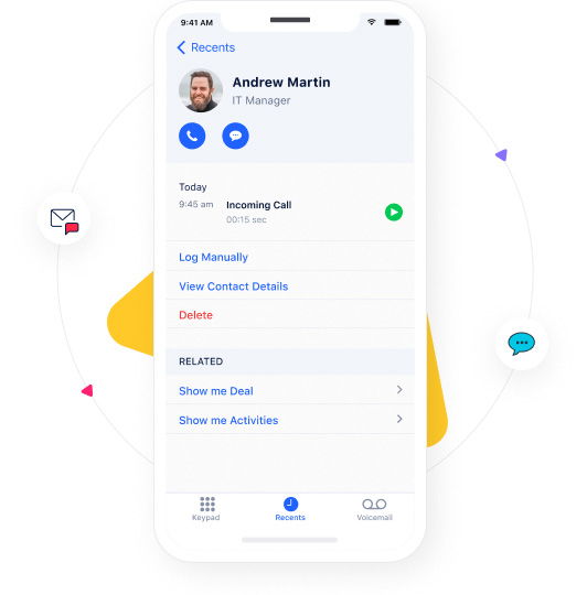 You have access to quick action buttons to make calls and send texts from any contact’s detail view. Moreover, you can fetch information to get better context about any deals or activities associated with a contact from the mobile app itself.