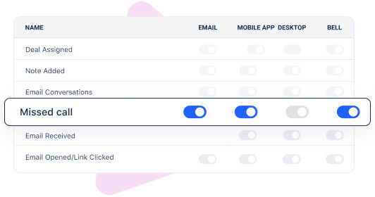 Now receive notifications for missed calls on your desired channel to prevent any opportunity from falling through the cracks. Enable and disable missed call notifications from settings and get alerts for the same on various channels. Don’t lose a crucial prospect just because you couldn’t answer a call; catch up with notifications, and reach your clients in a timely manner.