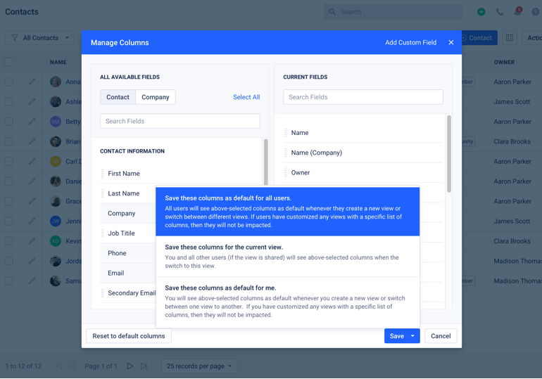 2. Better control for Admin users: Do you like to use the same column sets for each view across your organization. No need to switch between accounts and save it for an individual user. Now you have the power to set the same set of columns for each user with a single click.