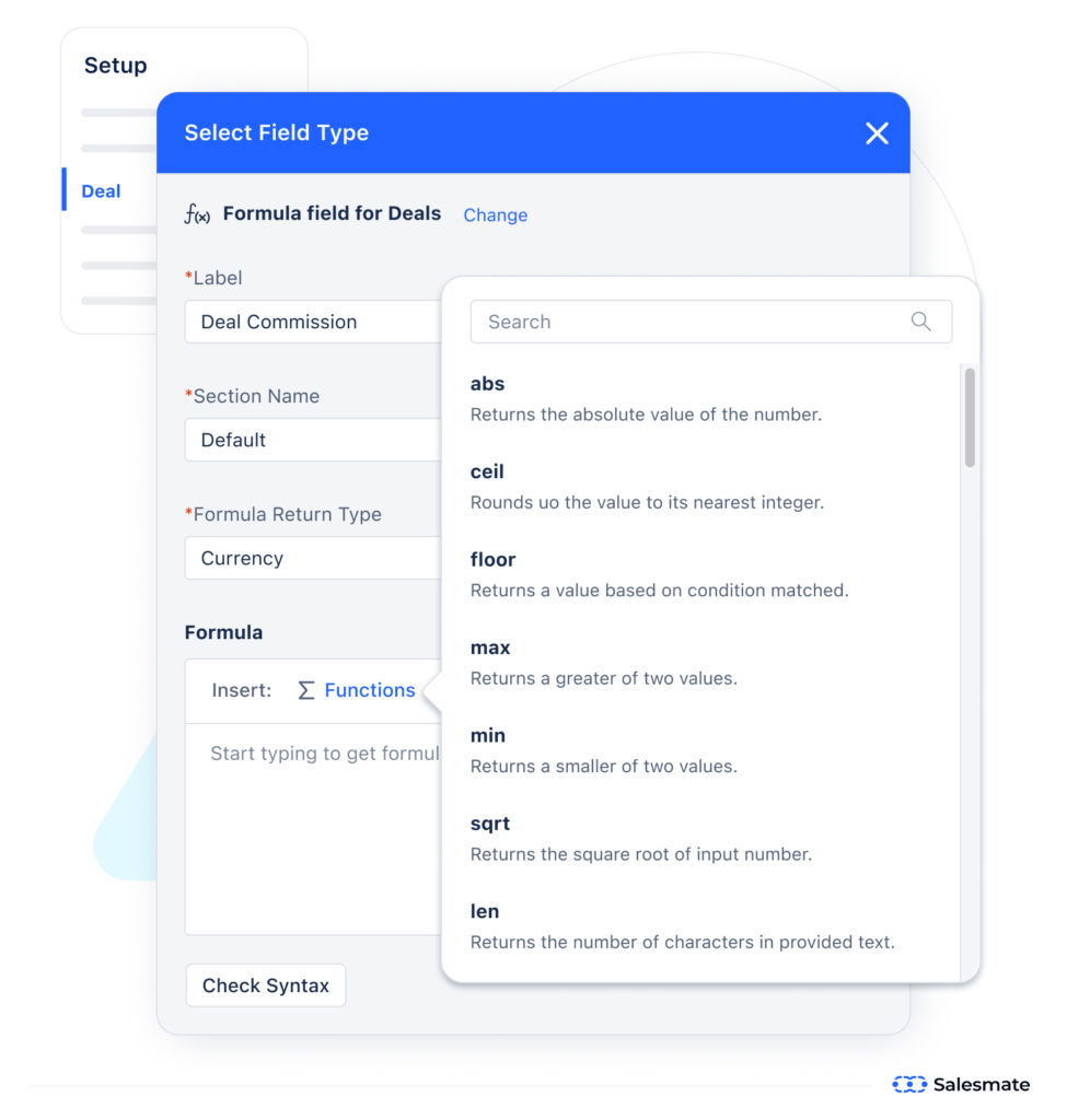 Basically, you type in a formula, and Salesmate automatically calculates the required value for Contacts, Companies, Deals, and Activities.